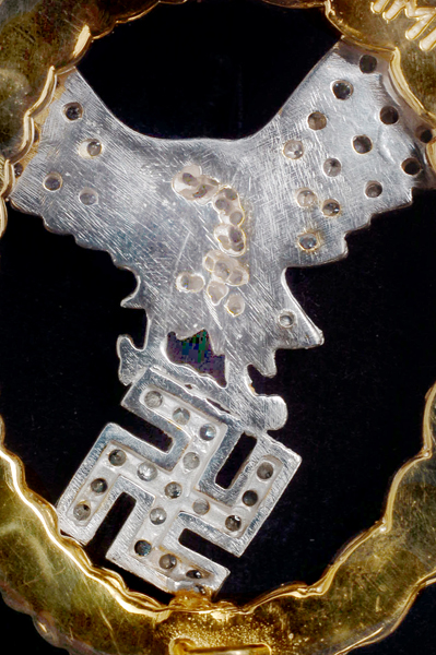 This Luftwaffe Pilot/Observer Badge with Diamonds is a jeweler's copy of the official "Dress Version" worn by Reichsmarschall Goering. The eagle is cast in solid silver, the wreath also cast in silver with 14K gold plating, the 103 Zirconia diamonds are professionally hand mounted just like the originals. This gorgeous award is handmade in North America by a second-generation jewelry firm specializing in high-end jewelry.